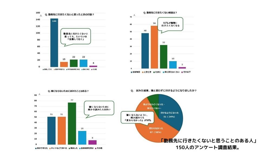「行きたくない」という気持ちを抱えながら、働くのは大変で、体や心の不調を感じる人は121人(81%)でした。何とかしたいと、「自分で考えた」51人、「ネットや本などで調べた」51人、「信頼できる人に相談した」77人、「医療機関を受診した」25人(複数回答)など。何か対策を取ってみるけれども、以前のように嫌でなく行けるようになった人は51人(34%)という状況です。中には「以前よりもひどくなった」「答えたくない」としている人も(12人、8%)。