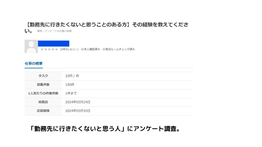 私が2024年5月にクラウドワークスで「勤務先に行きたくないと思うことのある人」対象に実施したアンケートでも、開始からわずか約2時間の間に、150人の人に回答をいただいてクローズしました。実施前は回答が集まるかどうか不安だったのですが、杞憂でした。